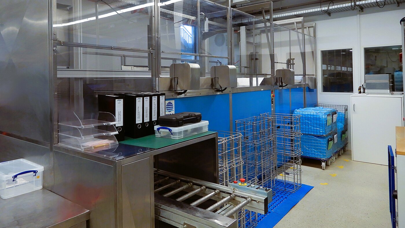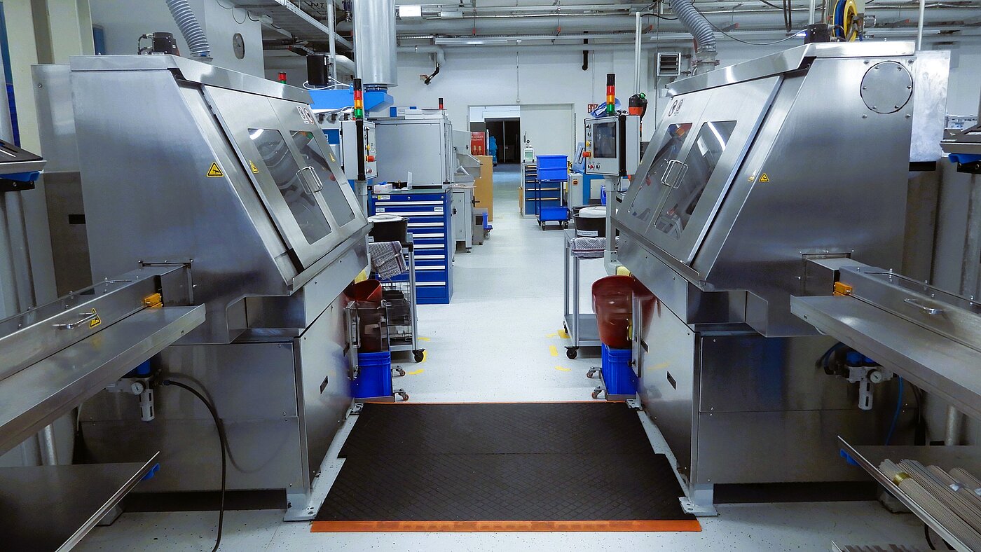 Die abschließende Reinigung erfolgt in einer vollautomatischen Reinigungsanlage. Sie stellt sicher, dass alle Produkte die hohen Reinheitsanforderungen der Medizintechnik erfüllen und rückstandsfrei in die Weiterverarbeitung, Montage oder Verpackung übergehen.